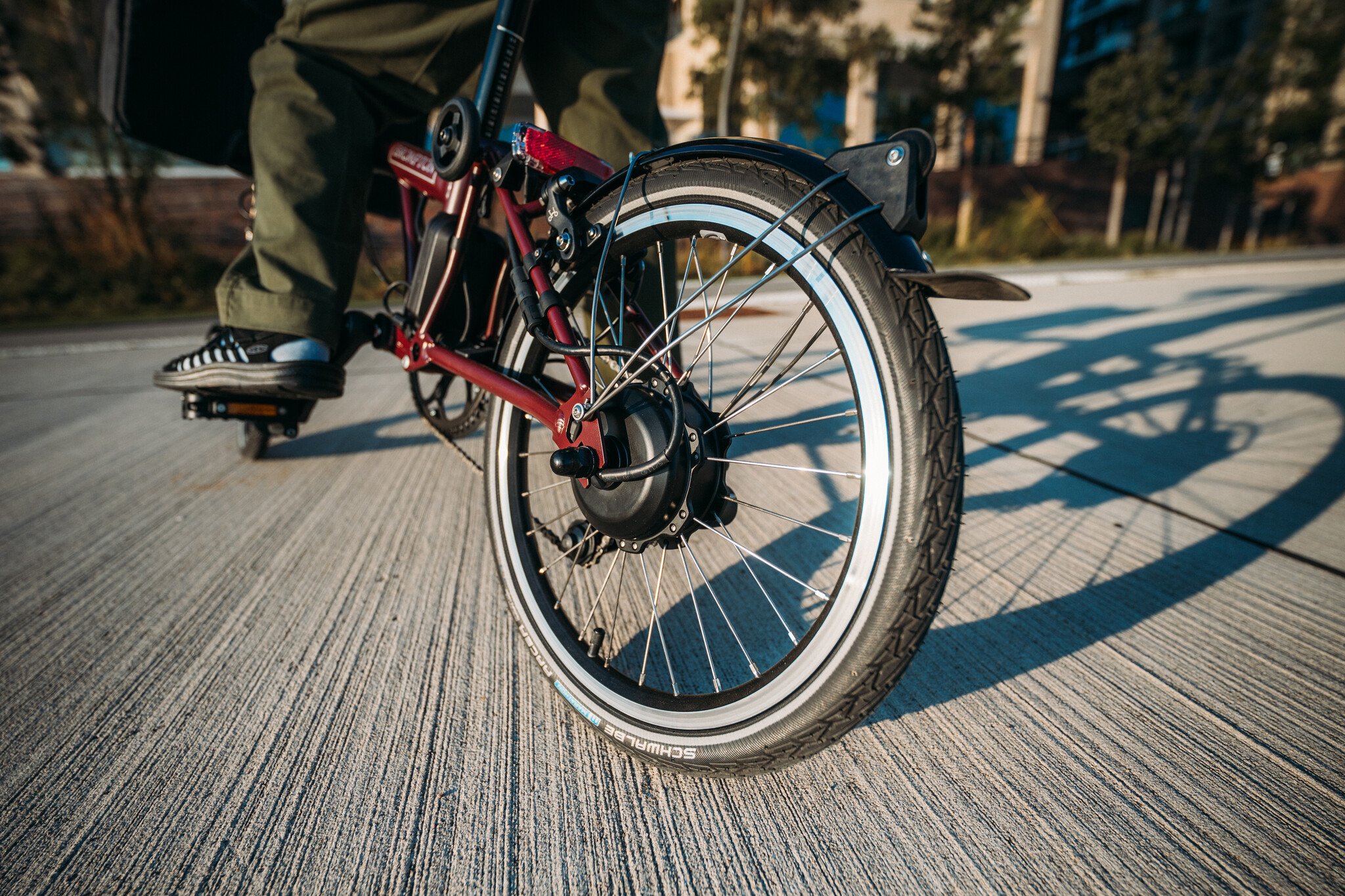 The new rear triangle was designed in conjunction with Brompton’s revolutionary new electric assist system, e-Motiq. Unlike Brompton’s previous front hub motor, the e-Motiq system is powered by a rear hub motor, which allows for the electric assist to feel like a helpful push on the same wheel that you’re pedaling.